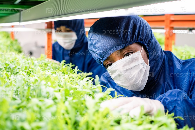 Исследовательница в области защитной рабочей одежды стоит на полке с зелеными саженцами