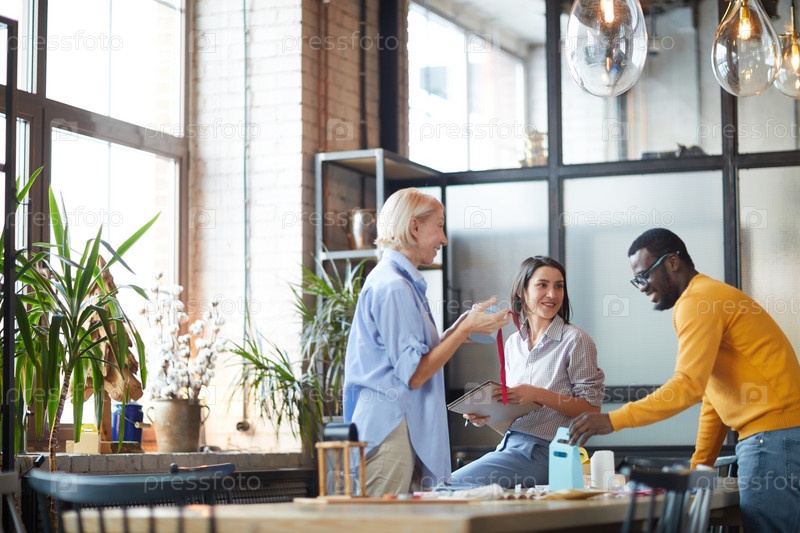 Группа позитивных мультиэтнических творческих создателей в повседневной одежде обсуждает подарковый пакет и представляет идеи на семинаре