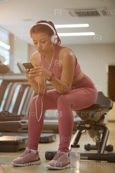 Красивая женщина, использующая смартфон в спортзале