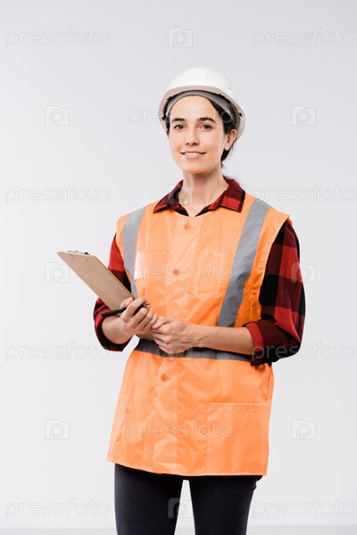 Успешная женщина-инженер с шлемом и оранжевой курткой, держащая в руках клипборд