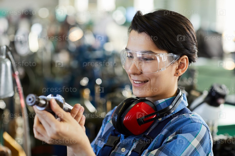 Улыбающаяся удовлетворенная молодая женщина в прозрачных очках, носящая защитные устройства для ушей, изучает металлический дрельчик при выборе деталей для металлообработки