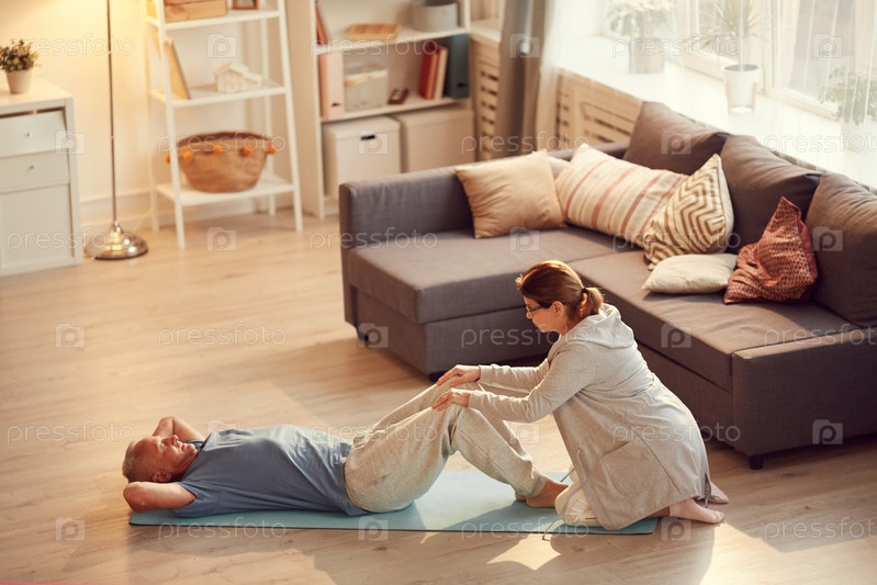 Спортивный старший мужчина с руками за головой, лежащий на матке йоги и занимающийся физическими упражнениями с терапевтическим тренером по физической подготовке дома