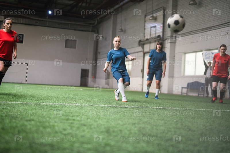 Молодые футболистки смотрят на мяч, движущийся к воротам