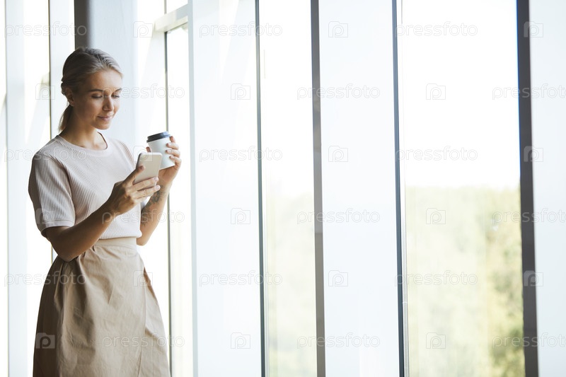 Контент привлекательная блондинка в юбке стоит у окна и читает сообщение по телефону, выпивая кофе