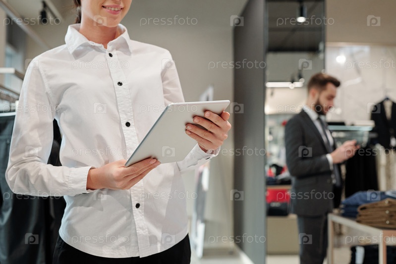 Счастливая молодая консультантка бутика прокручивает новые онлайн-предметы