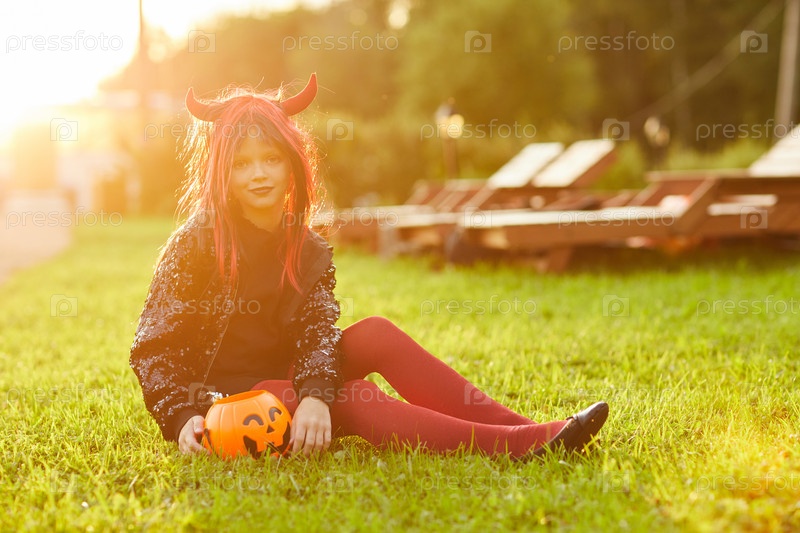 Девушка, сидящая на траве Хэллоуин
