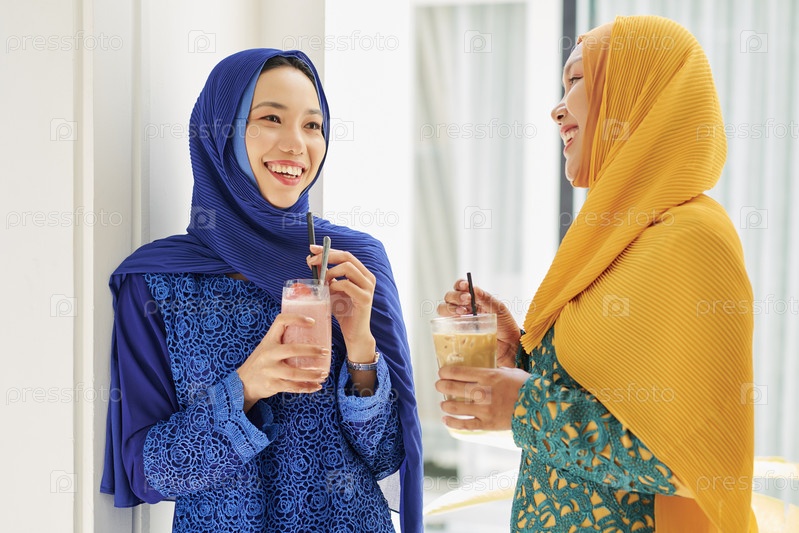 Красивые женщины разговаривают и пьют смузи