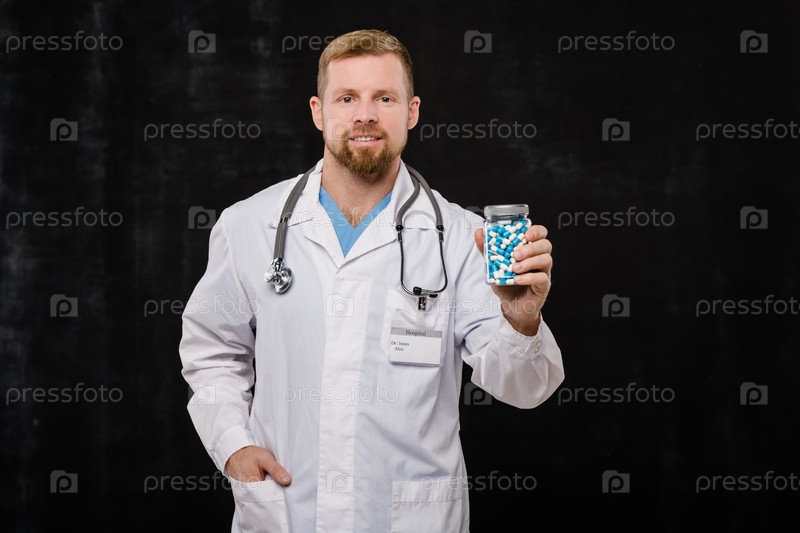 Счастливый молодой бородатый доктор в белом халате, держащий бутылку с таблетками