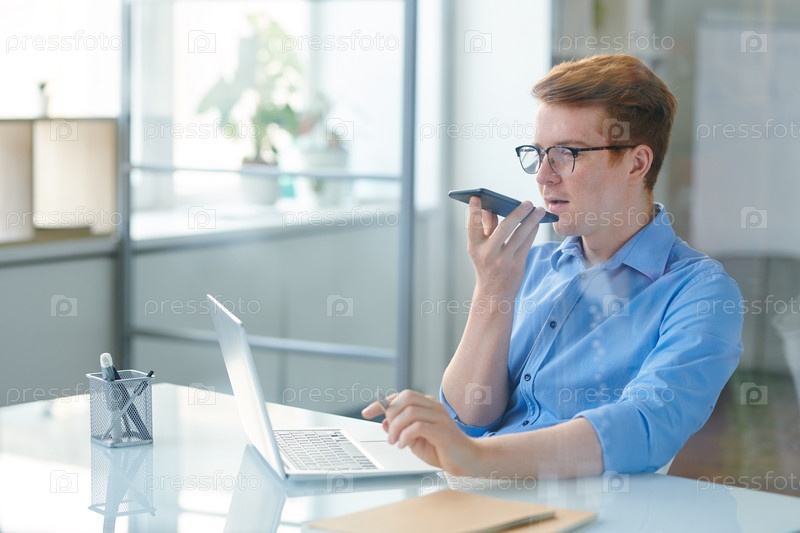 Современный офисный работник, использующий приложение голосовых сообщений