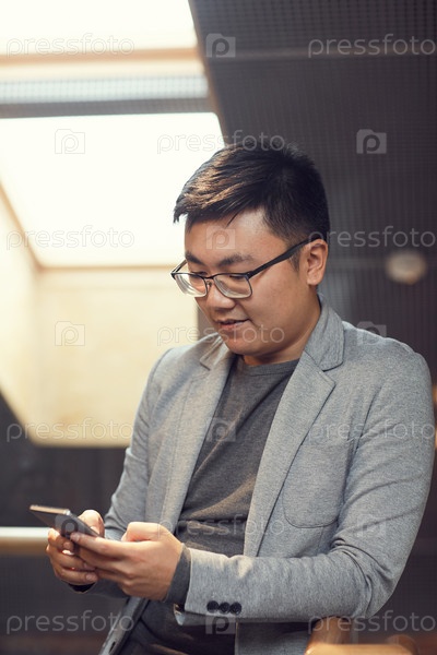 Молодой азиатский бизнесмен использует смартфон в офисе