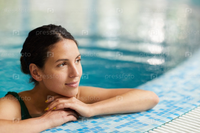Близкий план задумчивой привлекательной брюнетной женщины с волосами, опирающейся на край бассейна