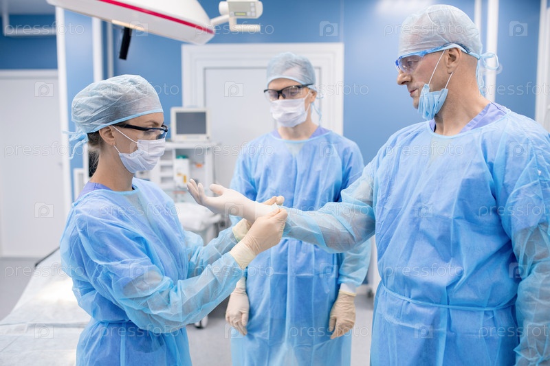 Молодая медсестра помогает профессору в защитной форме надеть перчатки в больнице