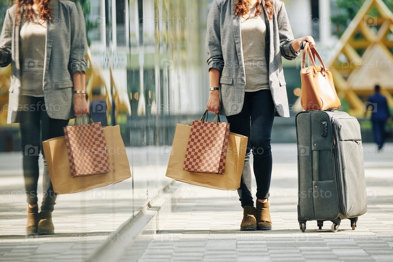 Женщина-путешественница с чемоданом и сумками для покупок