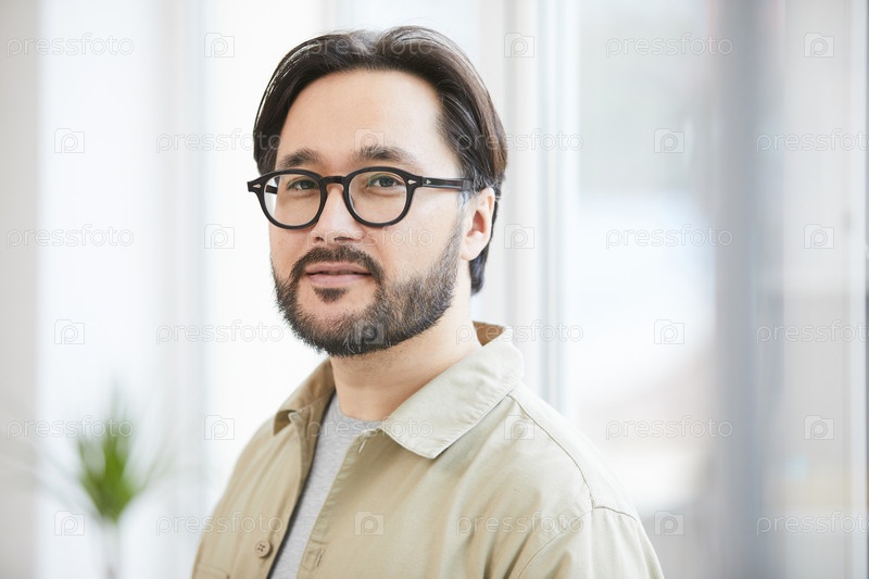 Портрет контента уверенный хипстер молодой азиатский парень с бородой, носящий рубашку и очки в современном офисе