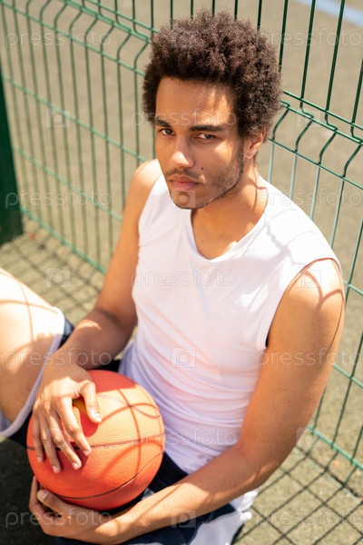 Красивый активный парень с мячом смотрит на тебя, когда ты отдыхаешь