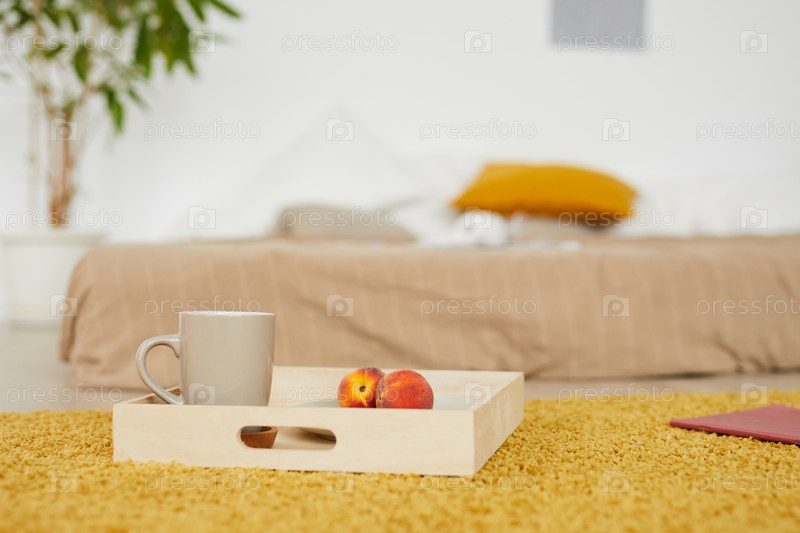 Сосредоточьтесь на деревянной подносе с персиками и кружкой, размещенных на желтом ковре в спальне