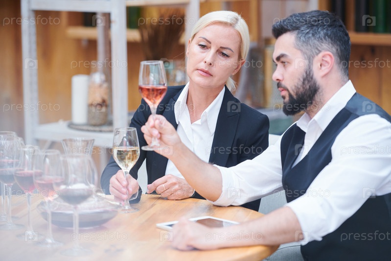Серьезные и внимательные сомелье оценивают цвет образца вина