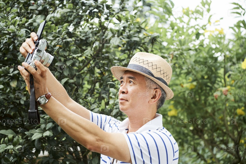 Мужчина делает селфи-портрет на открытом воздухе