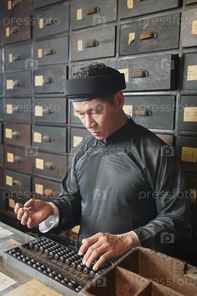 Работник аптеки делает расчеты с помощью абакаса