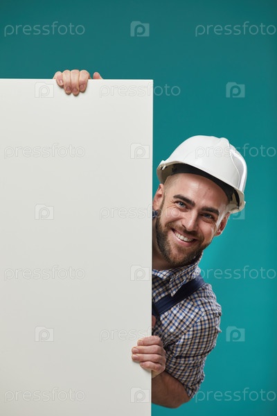 Веселый рабочий с пустым плакатом