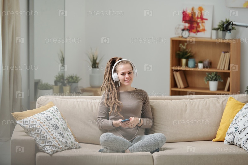 Красивая девушка в спортивной одежде и наушниках смотрит на тебя, отдыхая на диване