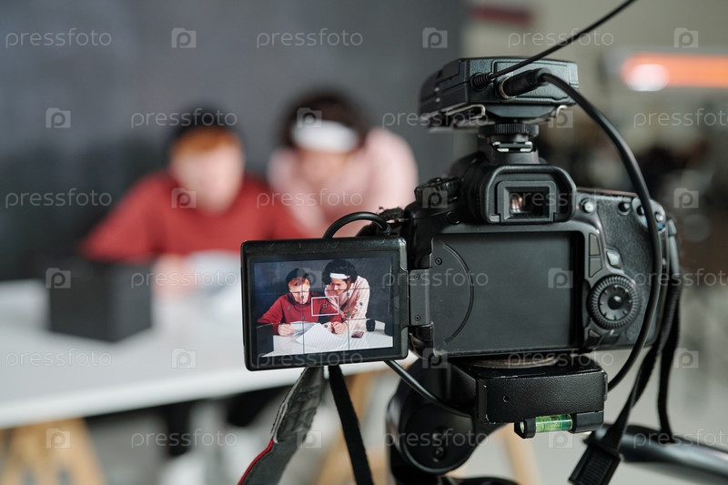 Два молодых современных мужских влогера на экране видеокамеры в студии