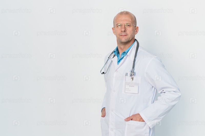 Молодой серьезный врач в белом халате держит руки в карманах