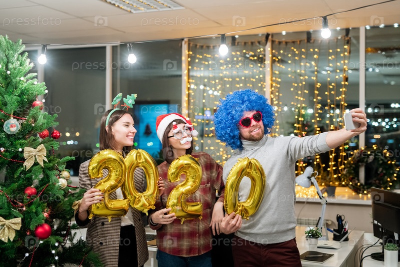 Три веселых молодых офисных менеджера, одетых на рождественскую вечеринку и делающих селфи