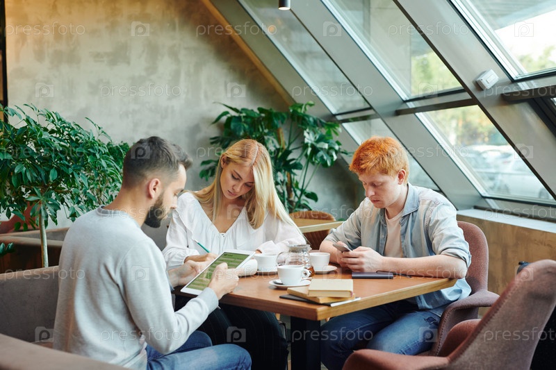 Два молодых человека, использующих гаджеты и умная девушка делают заметки в блокноте в кафе