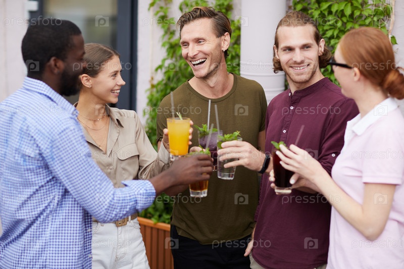 Группа друзей, наслаждающихся напитками на вечеринке в открытом воздухе