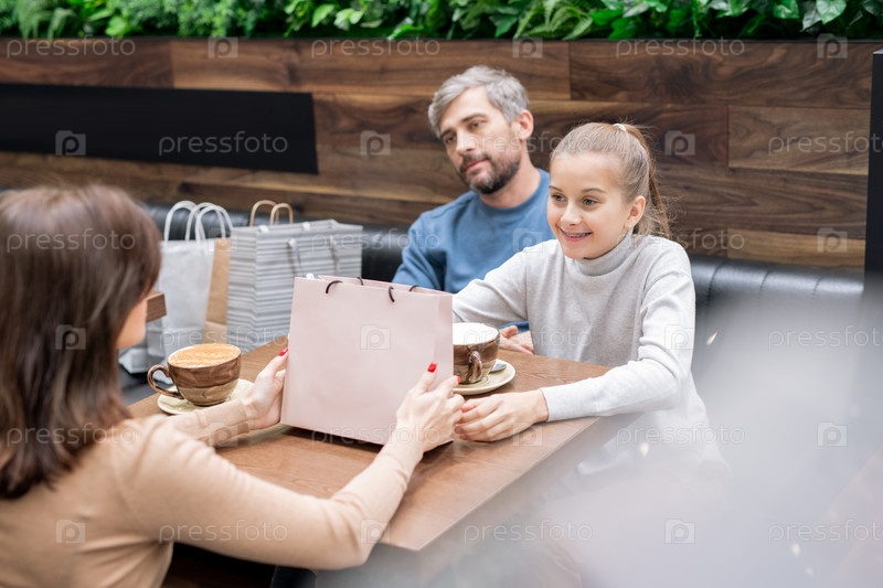 Красивая девушка и ее мать с бумажным пакетом смотрят друг на друга за столом в кафе