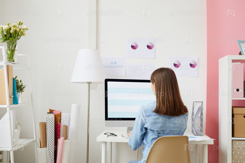 Задний вид брюнетки в джинсовой рубашке, сидящей перед современным компьютером и готовящей презентацию по бизнес-анализу
