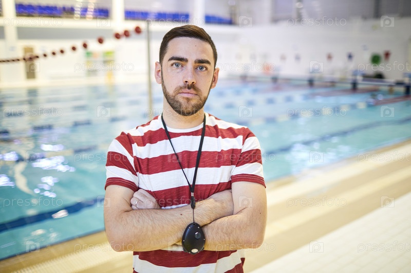 Молодой тренер стоит в бассейне