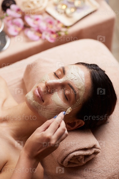 Расслабленная молодая брюнетка лежит на удобном столе с полотенцем под головой, пока косметолог наносит ей маску для лица
