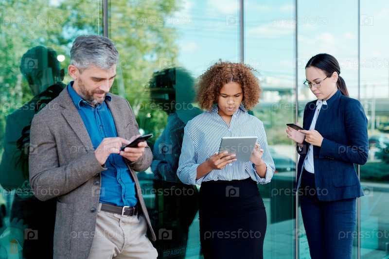 Три молодых современных коллеги в формальной одежде прокручивают мобильные гаджеты