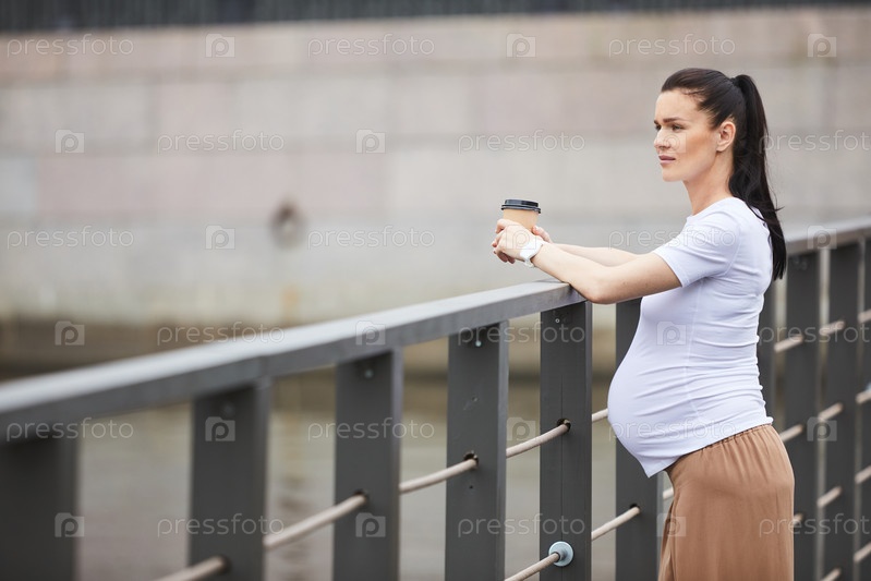 Женщина пьет кофе на мосту