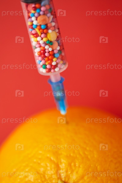 Близкий план медицинского шприца со сладкими посыпаниями и апельсином, добавляя искусственные подсластители в концепцию фруктов