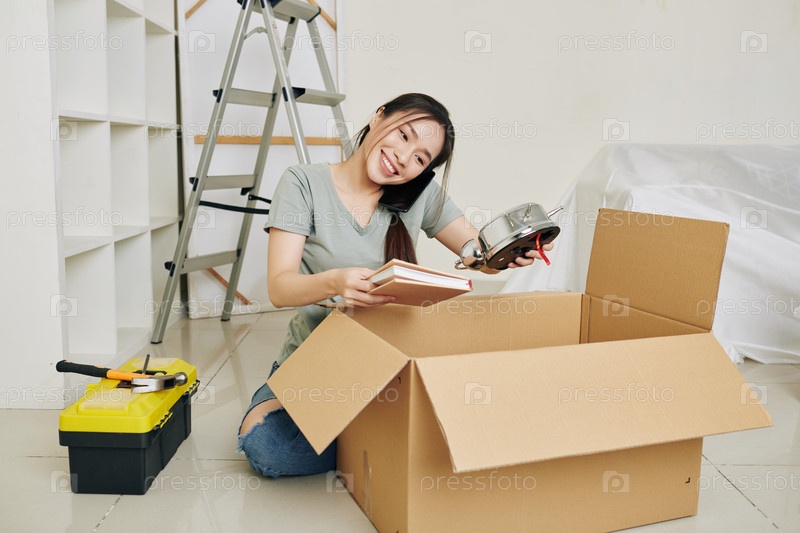 Женщина распаковывает вещи в арендованной квартире