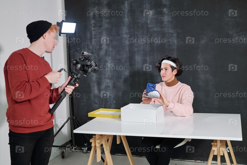 Молодой влоггер показывает новую обувь своему другу с видеокамерой перед ним