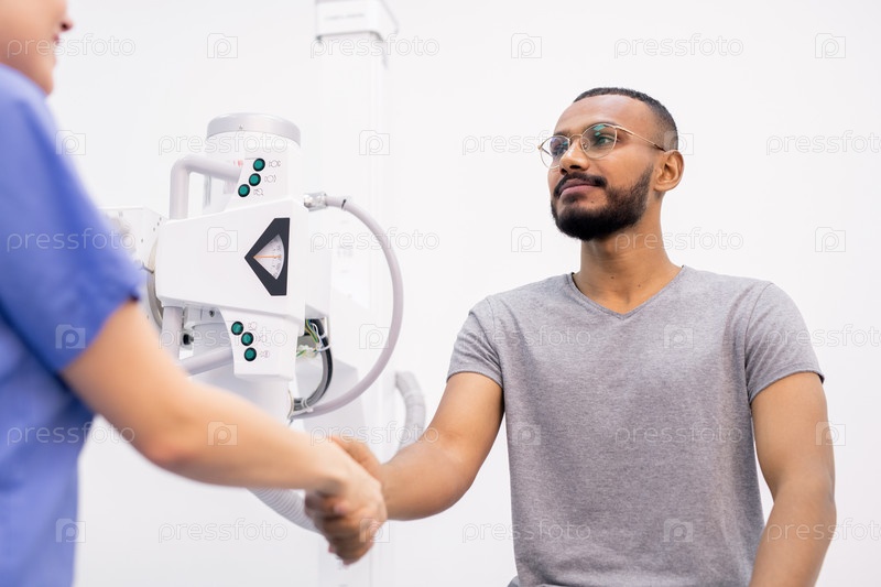 Молодой благодарный межкультурный пациент пожимает руку своему врачу после выздоровления