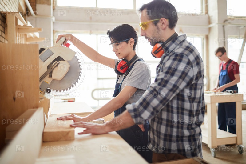 Молодая женщина режет древесину на фабрике