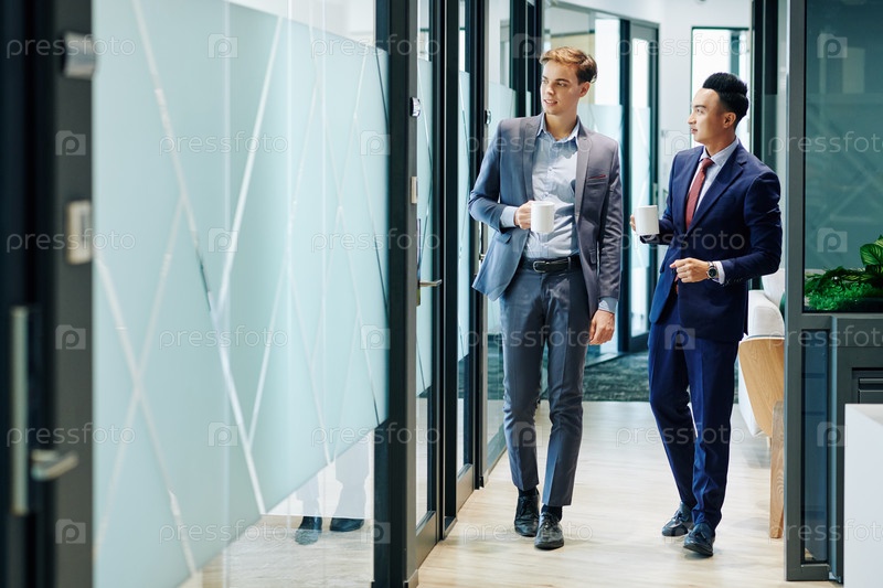 Бизнесмены, гуляющие по коридору офиса