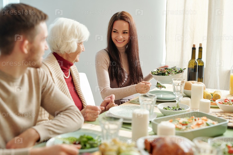 Улыбающаяся молодая женщина кладет салат на тарелку бабушки, глядя на нее