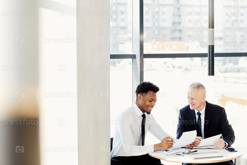 Улыбающиеся мультиэтнические бизнес-партнеры в формальных нарядах сидят за круглым столом и вместе просматривают деловые документы