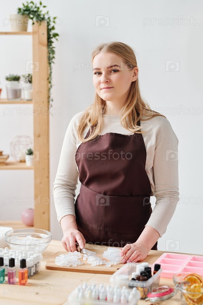 Счастливая молодая ремесленница стоит за столом в студии во время процесса производства мыла