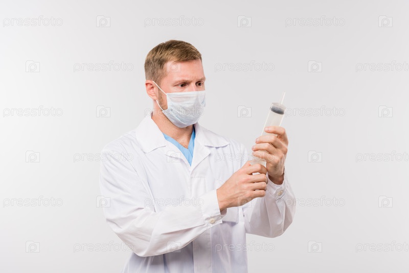 Молодой клиницист-мужчина в белом халате и защитной маске, держащий большую шприц