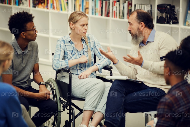Старший бородатый терапевт сидит в кругу молодых людей и жестикулирует руками, разговаривая с девочкой-инвалидом на инвалидном кресле во время групповой терапии