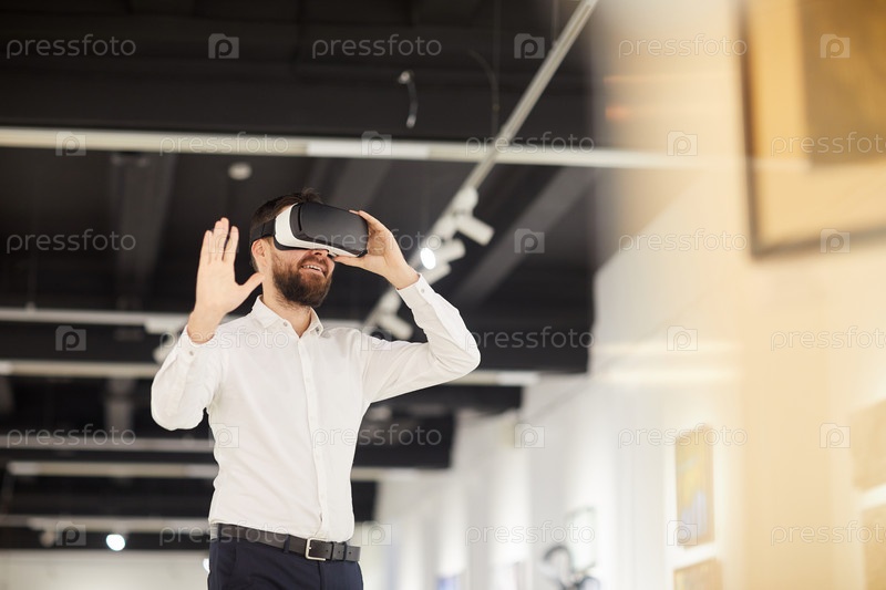 Бородатый человек использует VR в художественной галерее