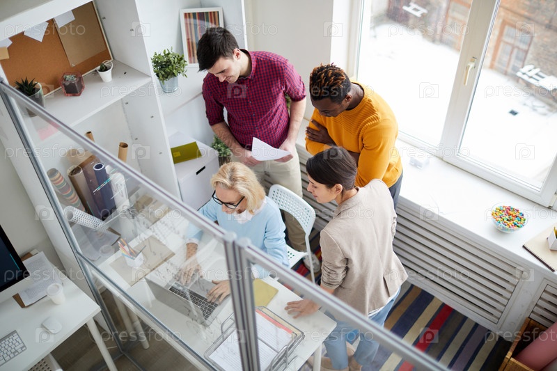 Загруженная умная женщина-программист в очках сидит за столом и использует ноутбук, показывая информацию коллегам в современном офисе