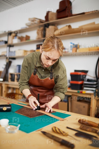 Женщина, делающая кожаный пояс